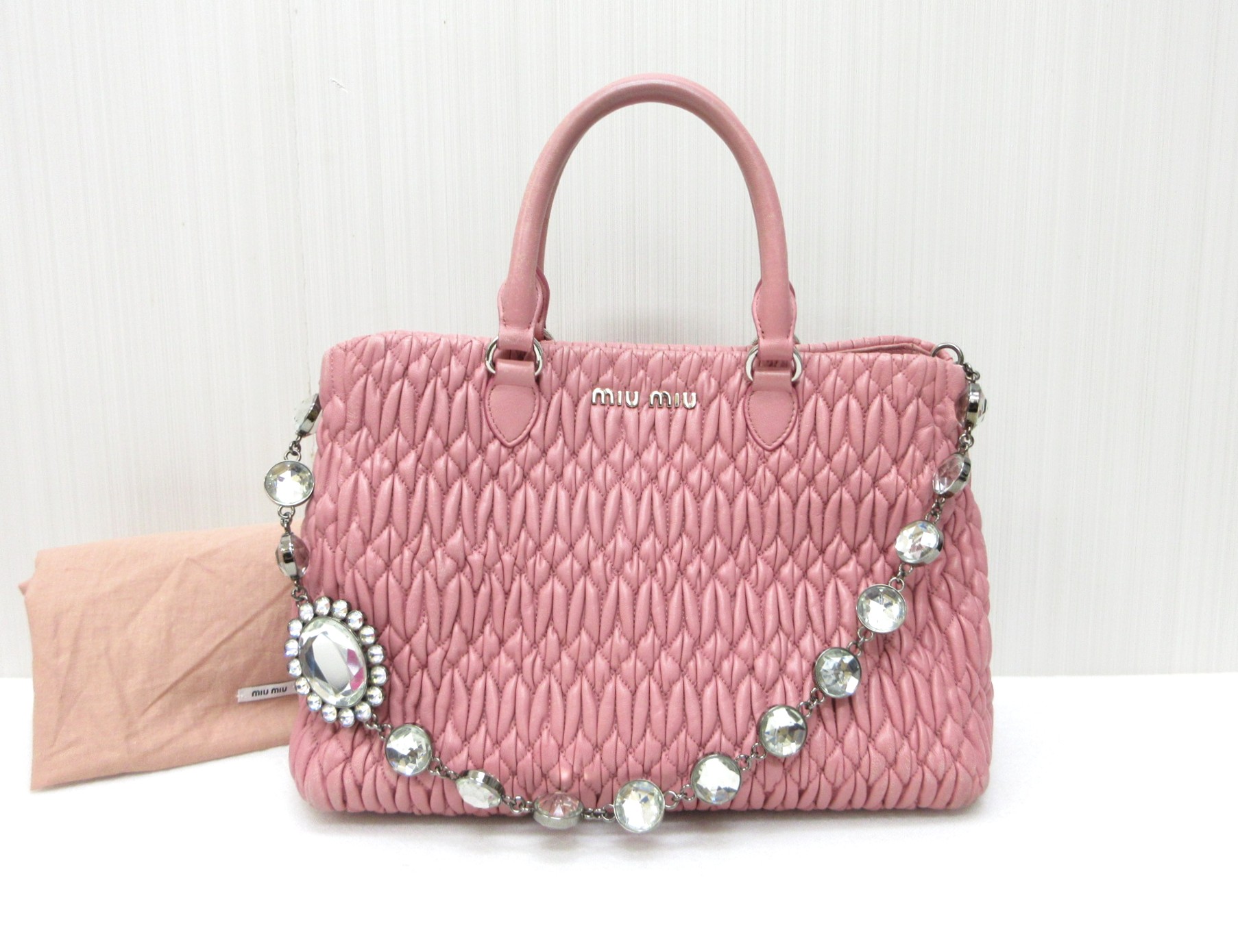 - miumiuミュウミュウのバッグマテラッセビジューストラップハンドバッグを買取させていただきました!